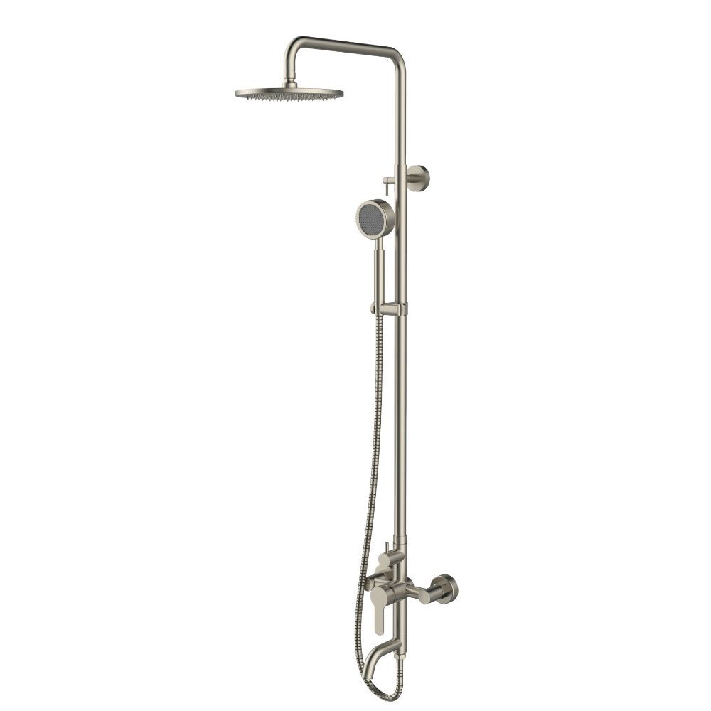 Душевая система в комплекте: однозахватный смеситель для ванны с керамическим картриджем и изливом (115 мм); верхний душ d 200 мм (с силиконовыми наконечниками для просто удаления известкового налёта и регулировкой угла наклона), ручной душ (1 режим), регулируемый по высоте и наклону держатель ручного душа, шланг 1,5 м (в металлической оплетке) с защитой от перекручивания, штанга 1117 мм. Переключение на душ осуществляется с помощью поворота излива. Цвет матовый никель.