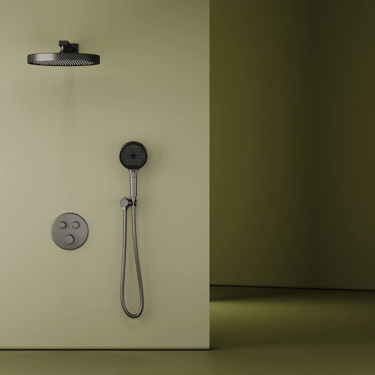 Душевой комплект SANCOS Space встраиваемый, c термостатическим смесителем, верхним, ручным душем и шлангом в комплекте, цвет вороненая сталь, арт. SC3006GMG