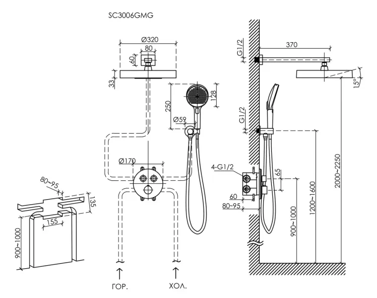 Размер верхнего душа, см:32