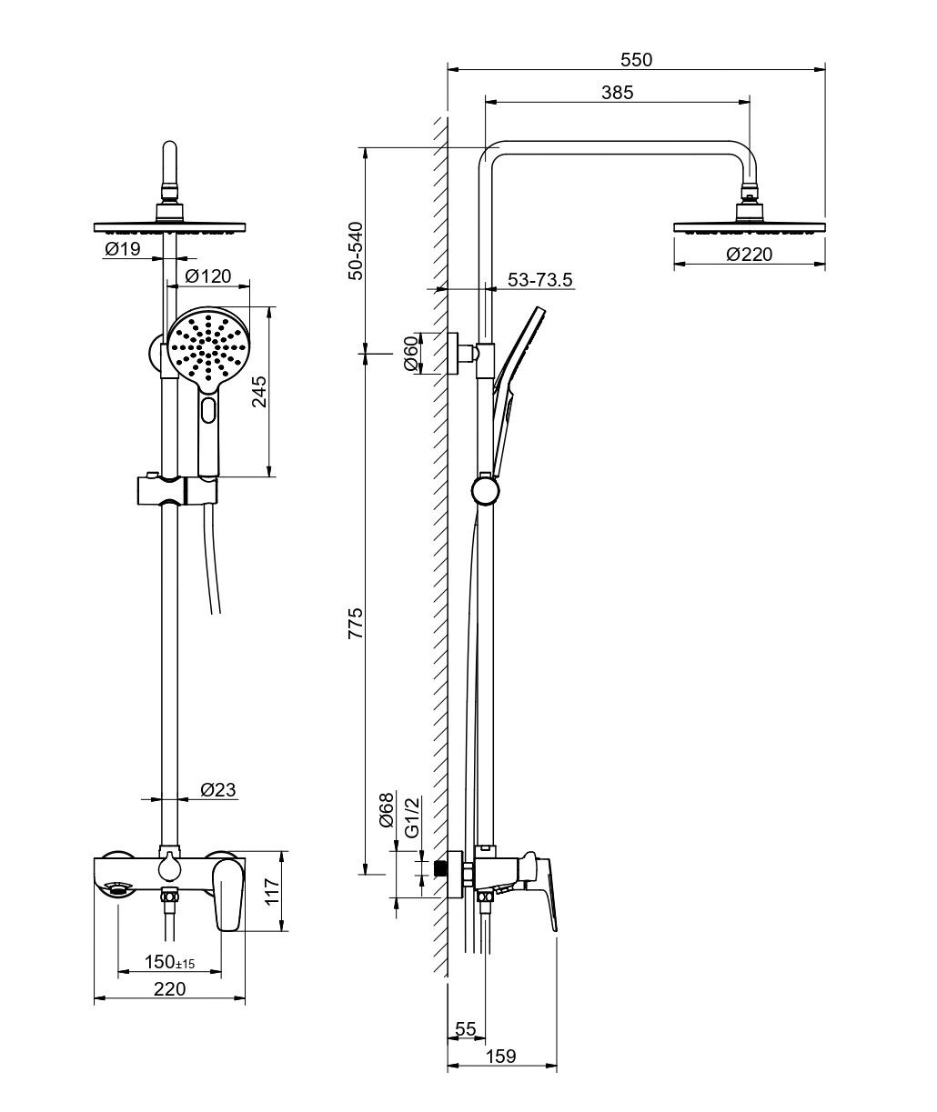• регулируемая душевая штанга из нержавеющей стали, выдвигающаяся до 1384 мм в высоту
