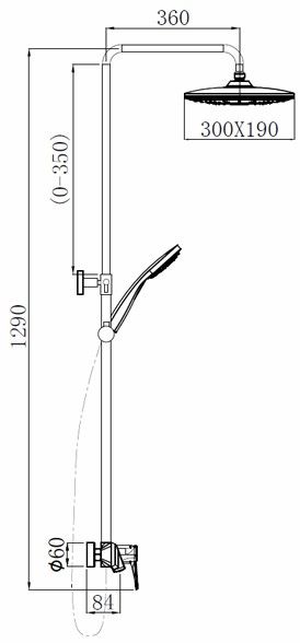 - прямоугольная лейка верхнего душа 390х190 мм, на шаровом шарнире, угол наклона 15 градусов