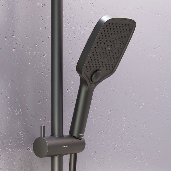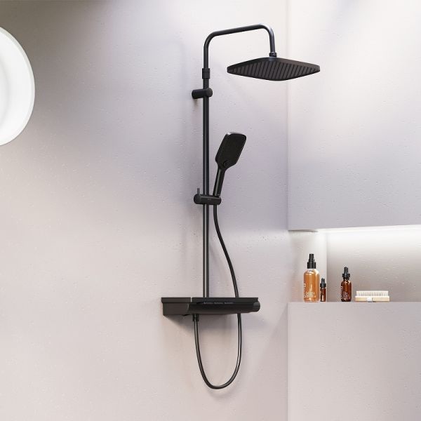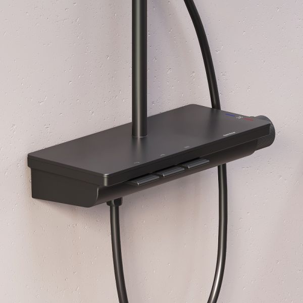 Душевая стойка Damixa Gala 953760300 с термостатом Черная матоваяМягкие геометричные формы, трендовое черное покрытие и солидное датское качество – идеальное сочетание для современной ванной комнаты. Простая и минималистичная на первый взгляд, душевая система Gala чрезвычайно функциональна и удовлетворит даже самого искушенного пользователя. Максимальная безопасность: термостатический картридж 35 мм обеспечивает точную настройку температуры и напора воды. Благодаря телескопической штанге с диапазоном регулировки в 400 мм водные процедуры будут одинаково комфортны абсолютно для всех членов семьи. Непревзойдённый комфорт и удобство: благодаря стильной полочке из ударопрочного закаленного стекла, вы можете хранить все необходимые вещи под рукой. Настоящее SPA прямо у вас дома: наслаждайтесь увеличенным размер тропической лейки с регулируемым углом наклона и 3-мя режимами ручного душа. Возможность включения 2-х или 3-х режимов одновременно сделает ваши ежедневные ритуалы незабываемыми. Простота и минимализм во всем: переключайте потоки воды между изливом, ручной и тропической лейкой нажатием всего одной кнопки. Специальное PVD-покрытие гарантирует чрезвычайную прочность душевой системы. Матово-черная поверхность не выцветает с годами и устойчива к механическим повреждениям, загрязнениям и отпечаткам пальцев.