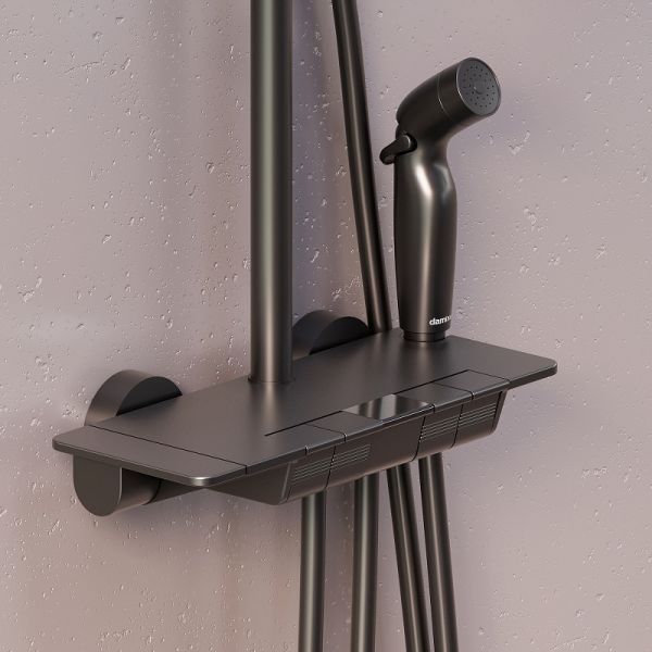 Душевая стойка Damixa Gala 953770300 с термостатом черная матоваяМягкие геометричные формы душевой система Gala в сочетании с трендовым черным покрытием идеально впишутся в современную ванную комнату. Минималистичная и стильная, она отличается самым широким функционалом в линейке и удовлетворит даже искушенного пользователя. Максимальная безопасность и технологичность: термостатический картридж 35 мм обеспечивает точную настройку температуры и напора воды. Душевая система оснащена автоматическим дисплеем, отражающим температуру воды в реальном времени. Непревзойдённый комфорт и удобство: тонкий латунный корпус выполнен в виде компактной полочки, где вы можете хранить все необходимые вещи. Благодаря телескопической штанге с диапазоном регулировки в 400 мм водные процедуры будут одинаково комфортны абсолютно для всех членов семьи. Простота и минимализм во всем: переключайте потоки воды между изливом, гигиеническим душем, ручной и тропической лейкой, а также плавно управляйте напором воды нажатием нескольких клавиш. Настоящее SPA прямо у вас дома: наслаждайтесь увеличенным размер тропической лейки с регулируемым углом наклона и 3-мя режимами ручного душа. Возможность включения 2-х или 3-х режимов одновременно сделает ваши ежедневные ритуалы незабываемыми.