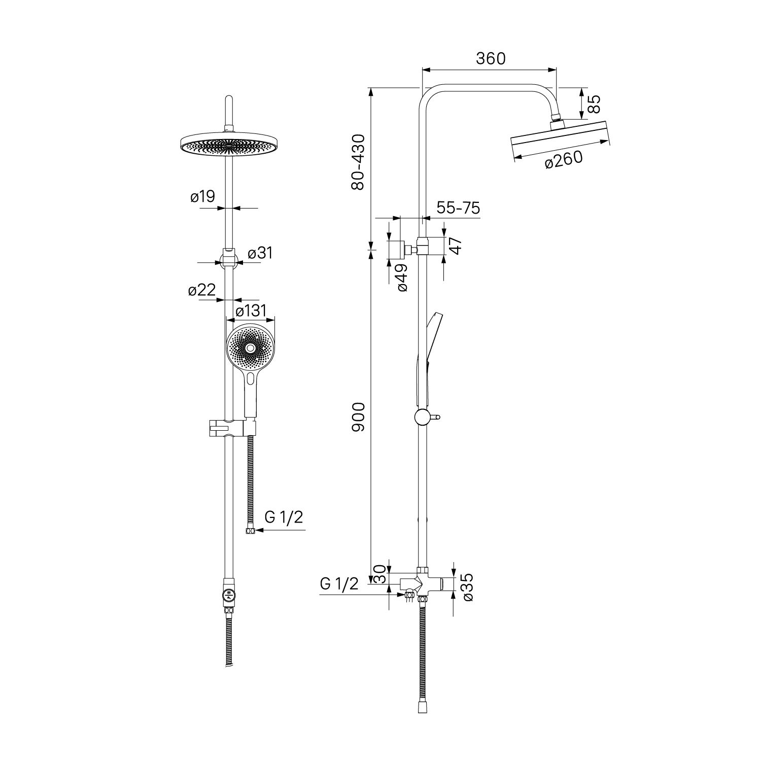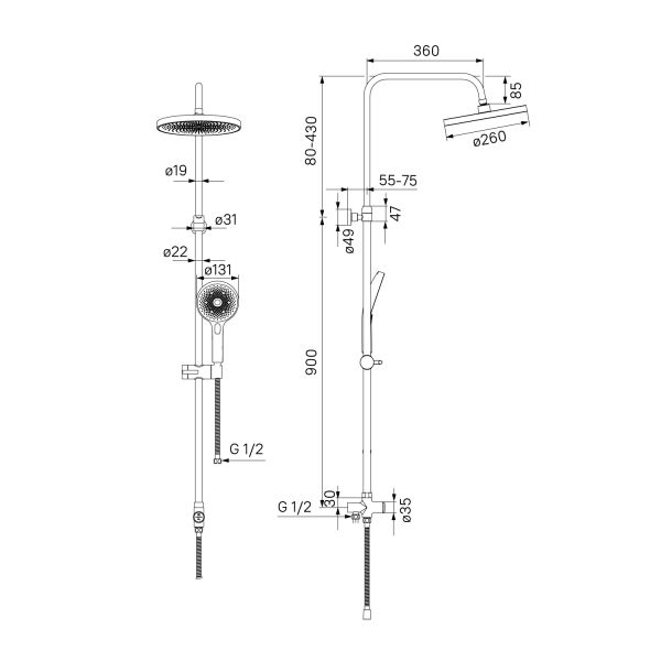 Стойка из нержавеющей стали диаметром 22 мм, регулируемая высота 950-1300 мм. Верхняя лейка из ABS-пластика 1-режимная, диаметр 260 мм. Цвет: корпус - хром, лицевая часть - тёмно-серая, форсунки белые из силикона. Шарнирное крепление. Ручная лейка из ABS-пластика 3-режимная, диаметр 130 мм, кнопочное переключение режимов. Цвет: корпус - хром, лицевая часть - тёмно-серая, форсунки белые из силикона. Кнопочный дивертор из латуни. Держатель-слайдер из ABS-пластика. Шланги из ПВХ с оплёткой из нержавеющей стали 1,5 м и 0,6 м.