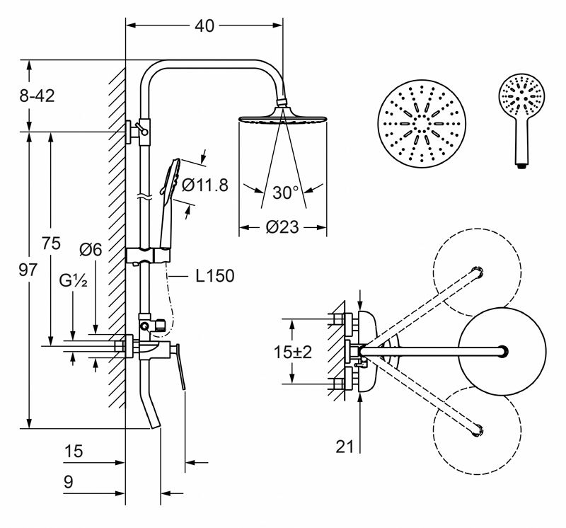 Горизонтальный душевой кронштейн, смеситель, переключатель на 3 положения, верхний душ, ручной душ, душевой шланг, s-образные эксцентрики, набор прокладок.