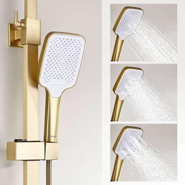 Душевая система Raglo R01.24.03.Цвет: сатин золотой.Материал: латунь.Управление: однорычажное.Механизм: керамический картридж.Излив: поворотный. Аэратор.Регулируемая по высоте душевая штанга: 1026-1566 мм.Форма верхнего душа: прямоугольная.Размер верхнего душа (ШхД): 340х220 мм.Регулируемый по высоте держатель ручного душа.Форма ручного душа: прямоугольная.Количество режимов струи ручного душа: 3.Отверстия для монтажа: 3.Стандарт подводки: G 1/2.Монтаж: на стену.