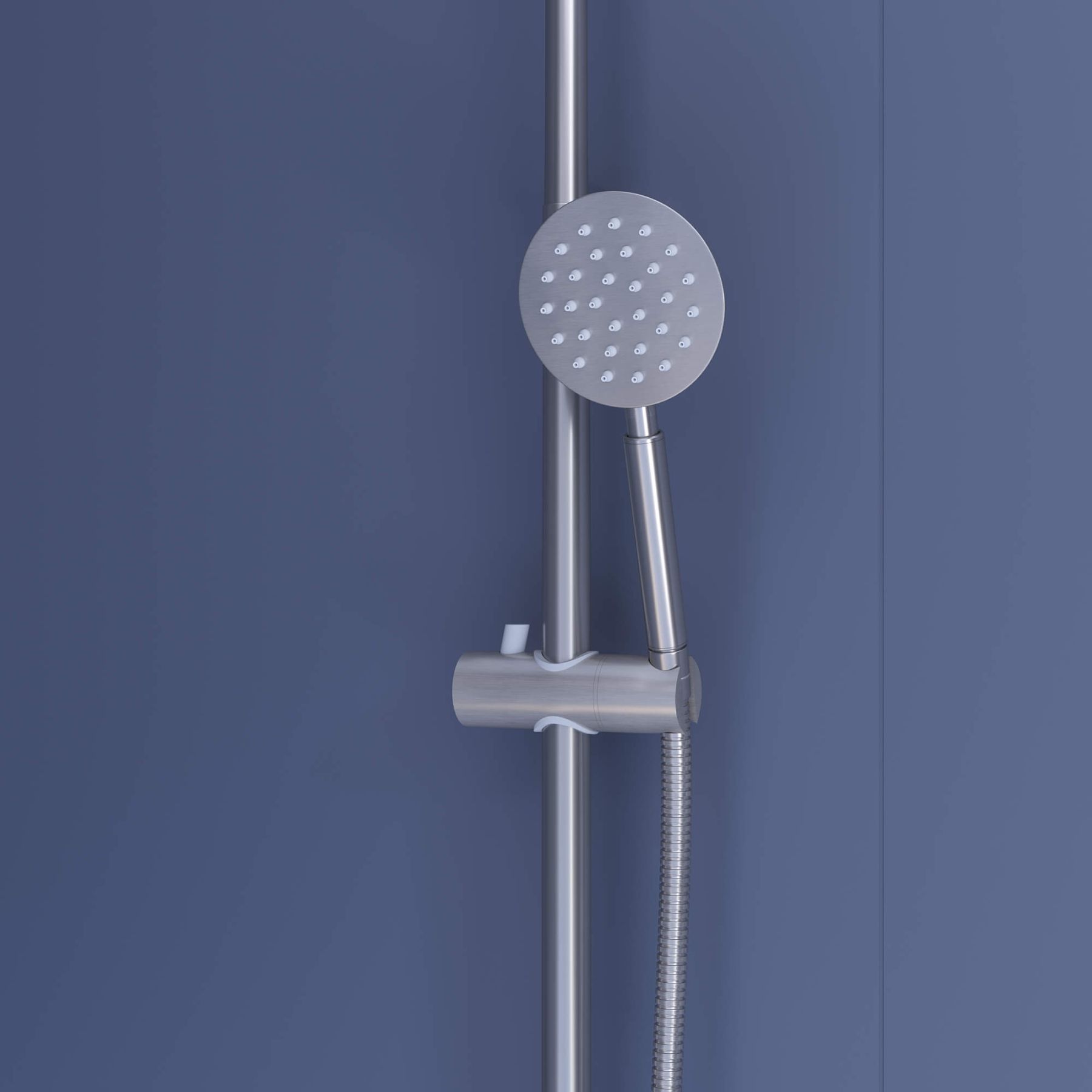 Душевая стойка RGW Shower Panels 59140124-13 - идеальное решение для вашей ванной комнаты. Изготовлена из высококачественных материалов: латунь и нержавеющая сталь, обеспечивая прочность и долговечность. Верхний душ имеет диаметр 20 см и круглую форму, обеспечивая комфортный и равномерный поток воды. Шланг изготовлен из стали и имеет длину 1.5 метра для удобства использования. Смеситель сделан из латуни, оснащен керамическим картриджем, обеспечивая долгий срок службы до 10 лет. Подключение осуществляется через резьбу 1/2 дюйма. Подходит для бытового использования. В комплекте также имеется ручной душ из нержавеющей стали AISI 304 с регулировкой высоты и держатель для него. Стальная штанга с регулировкой высоты верхнего душа и удлиненный излив обеспечивают дополнительный комфорт во время принятия душа.Дополнительные характеристики: