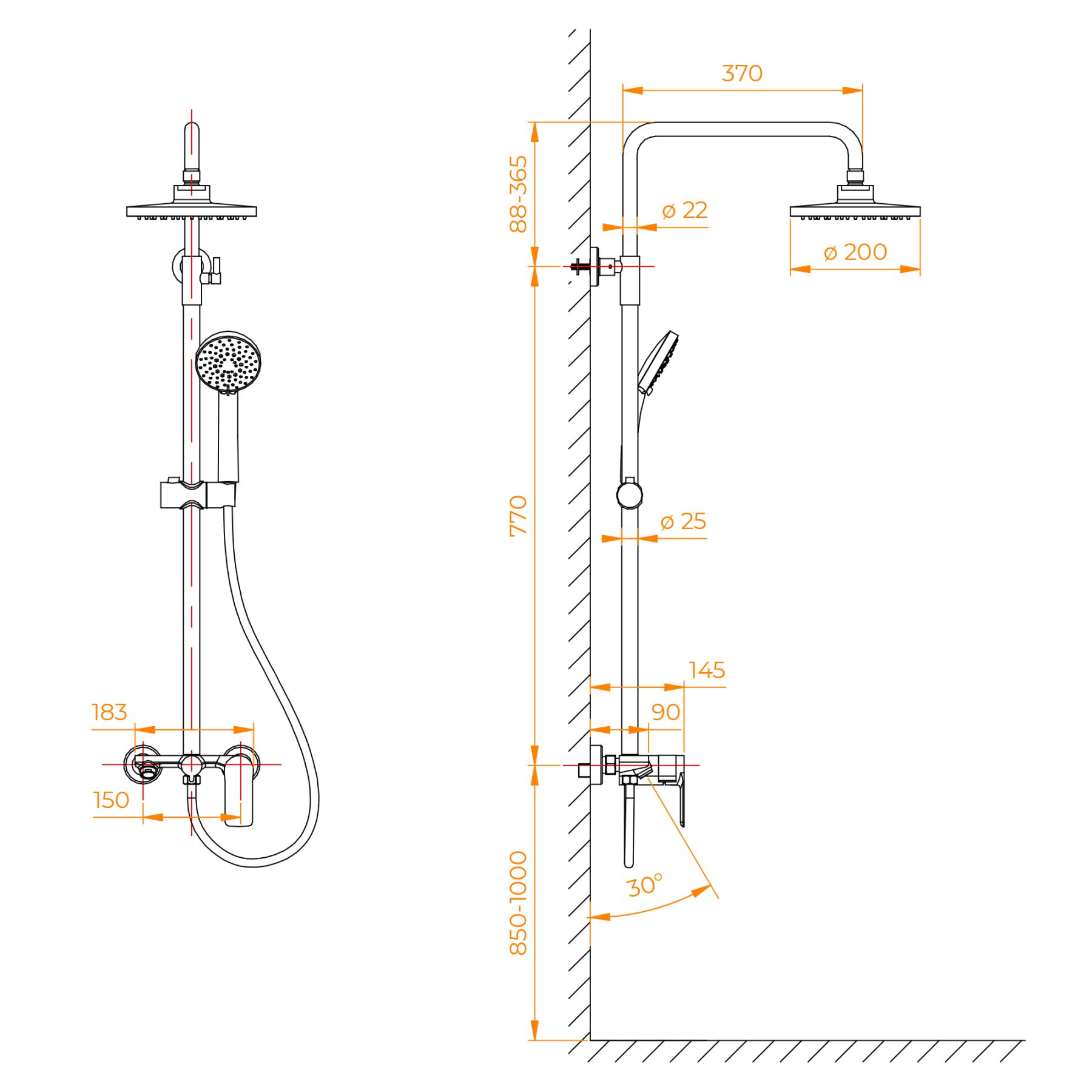- Стальная штанга с регулировкой высоты головного душа
