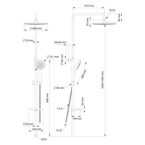 - ручной душ, с трехрежимной лейкой;