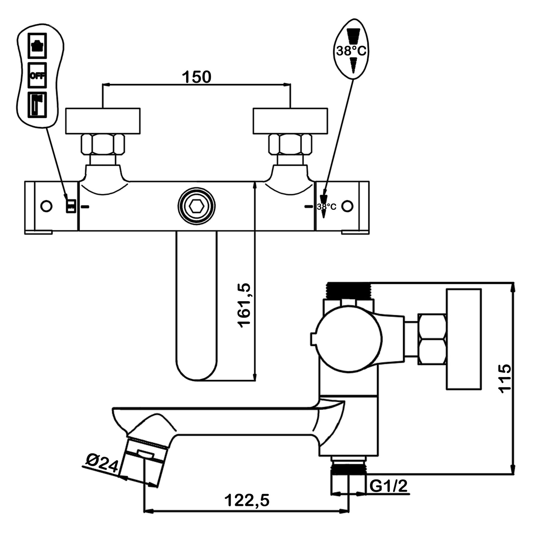 - термостатический смеситель для ванны с поворотным изливом в комплекте;