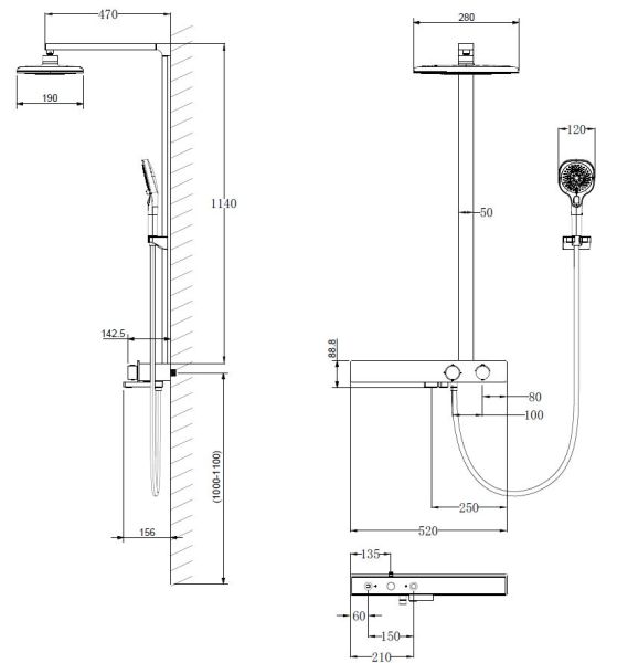 - Размер верхнего душа, мм: 280×190