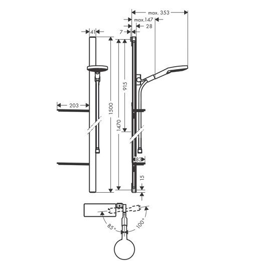 Держатель ручного душа регулируется в пределах 90°, поворачивается вправо и влево, перемещается вверх и вниз