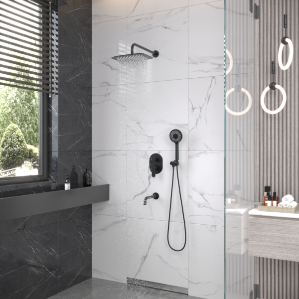 Душевой комплект BERGES VENTAS 3O - встраиваемый душевой комплект обладает трёхрежимной системой и состоит из верхней лейки - «тропического ливня», ручного душа, излива и смесителя.Лейка верхнего душа имеет инновационную систему самоочистки в виде гибких силиконовых вставок на форсунках душа, которые защищают изделие от известковых отложений. Верхний душ изготовлен из нержавеющей стали. Ручной душ – из ABS пластика. Оба душа имеют черное матовое покрытие, которое выглядит безупречно на протяжении всего периода эксплуатации.Шланг выполнен из нержавеющей стали (внутри epdm), смеситель с латунным корпусом имеет керамический картридж с пропускной способностью 28 л/мин, все держатели и кронштейны сделаны из латуни и нержавеющей стали.Скрытый монтаж комплекта позволяет создавать красивое и эргономичное внутреннее пространство всего помещения.