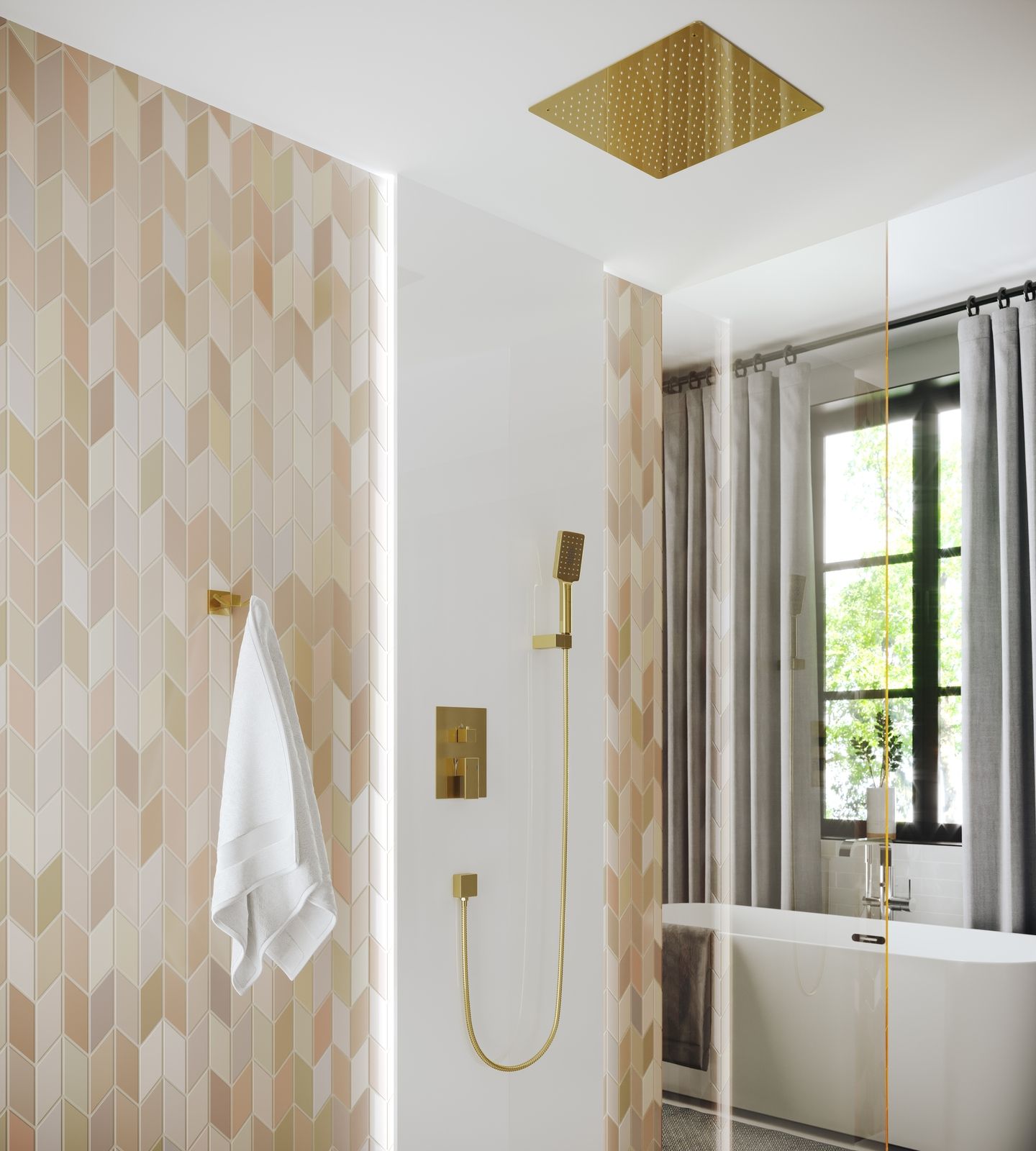 Цвет "матовое золото" никогда не выйдет из моды, во все времена драгоценный металл был признаком богатства.Встраиваемая душевая система Selene 2029, относится к премиальному сегменту, предназначена для монтажа в полой или твердой стене. Встроенный потолочный душ большого размера создает имитацию проливного дождя, вода обливает человека целиком. Регулируя напор воды можно получить массажное воздействие, что очень полезно для здоровья. Основные преимущества встроенной системы: элегантный внешний вид, все коммуникации и крепления спрятаны в стену и потолок, снаружи видны только декоративные элементы. Установить встроенную систему можно в любом месте. Использовать такой смеситель очень удобно, регулировка напора и температуры воды осуществляется одним рычагом. Переключение режимов "тропический душ" и "ручной душ" осуществляется поворотом ручки дивертора. Сложностей монтажа не возникает при установке элементов душевой системы опытным сантехником.