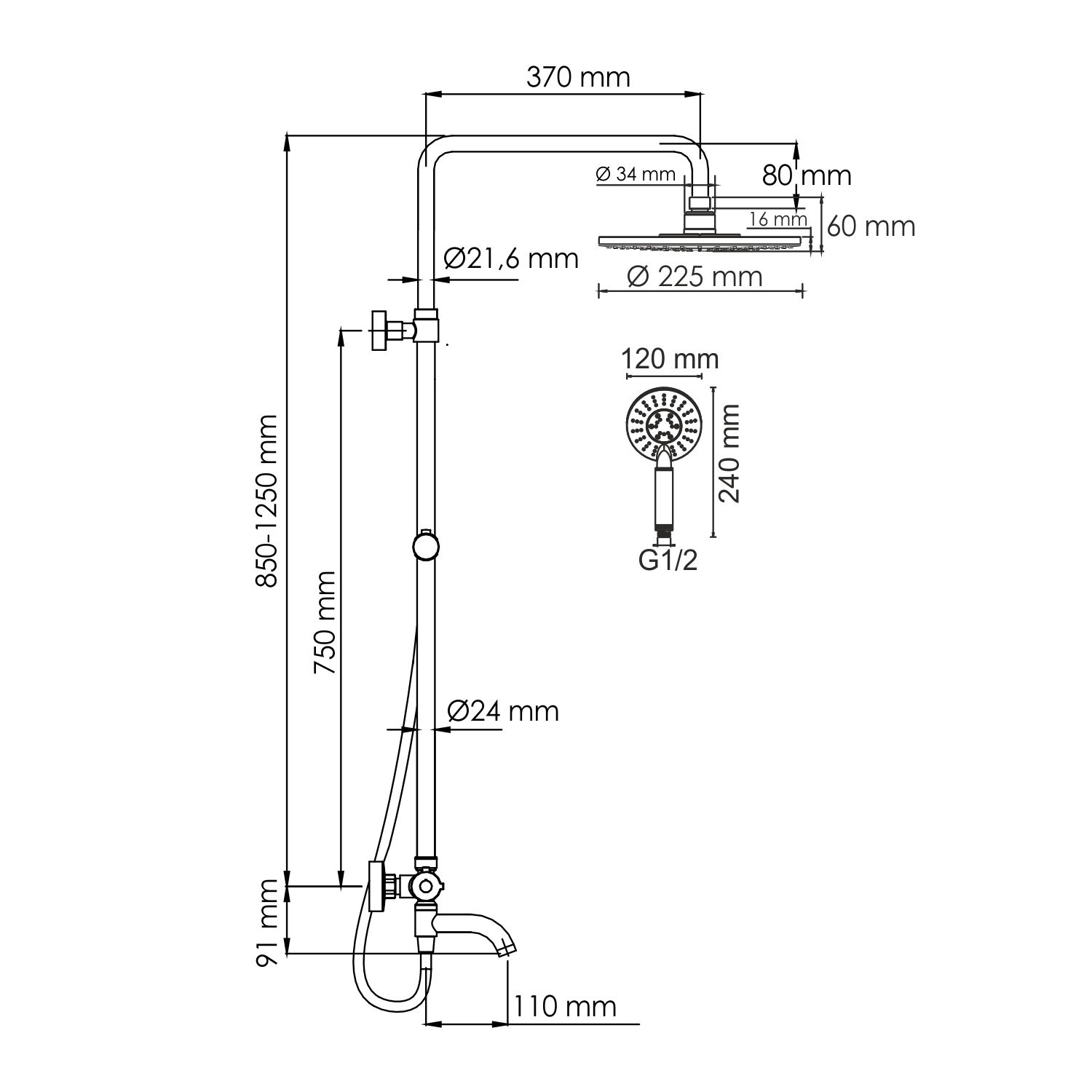 Стойка для душа, Ø 22 мм регулируемая по высоте