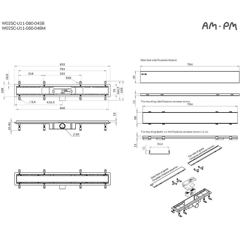 Душевой лоток AM.PM PrimeFlow 80 W02SC-U11-080-04BM с Черной матовой решеткой / под плитку Tile