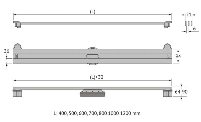 Решетка и декоративные заглушки, нержавеющая сталь AISI 304Комплект регулировки решетки по высоте от 8 до 25 ммСетка для волос, пластикКомплект гидроизоляцииЖелоб водосток, нержавеющая сталь AISI 304Монтажная заглушка, пенопластРегулируемые по высоте ножки, пластикСамопромывной S-образный сифон PPГоризонтальный выпуск D50 H60, пропускная способность 42л/мин, монтаж 360°Монтажный ключ, пластик
