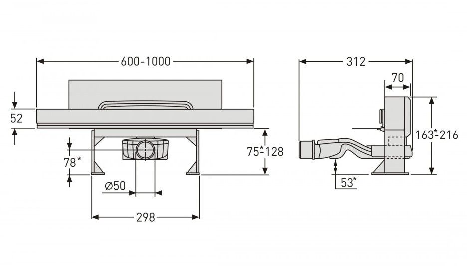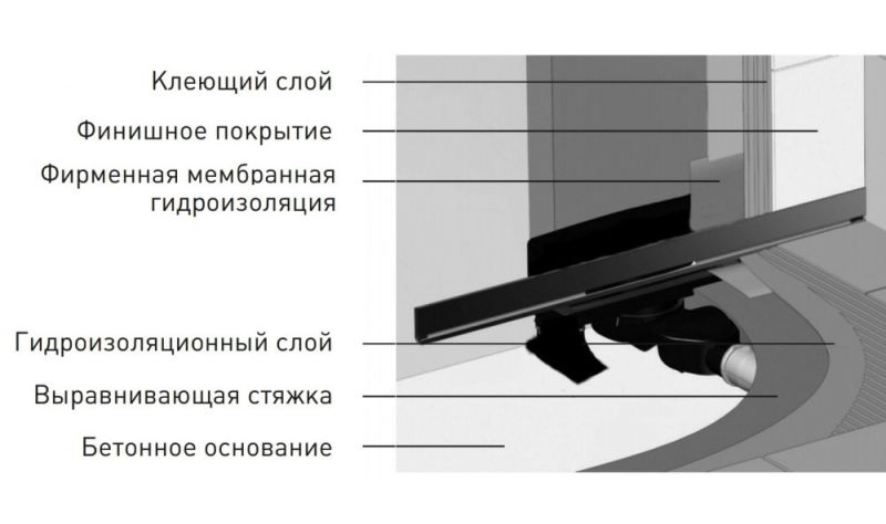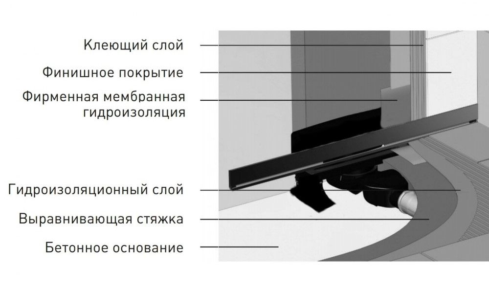 Решетка и рамка, нержавеющая сталь AISI 304Комплект регулировки рамки и монтажные углыСетка для волос, нержавеющая сталь AISI 304Комплект гидроизоляцииЖелоб водосток пристенныйPP Регулируемые по высоте ножки, пластикСамопромывной S-образный сифон с переходником PPГоризонтальный выпуск D50 H60, пропускная способность 42л/мин, монтаж 360°Монтажный ключ, пластик