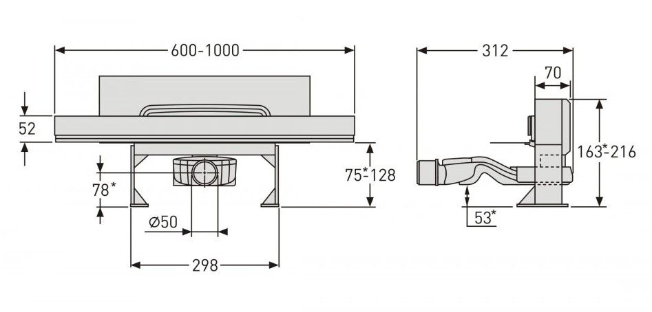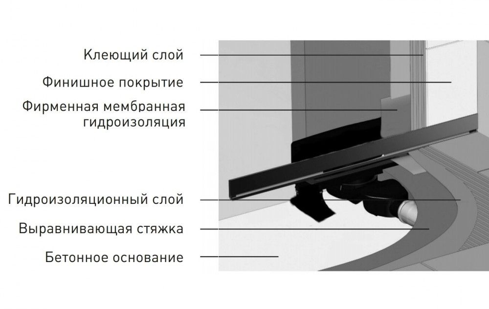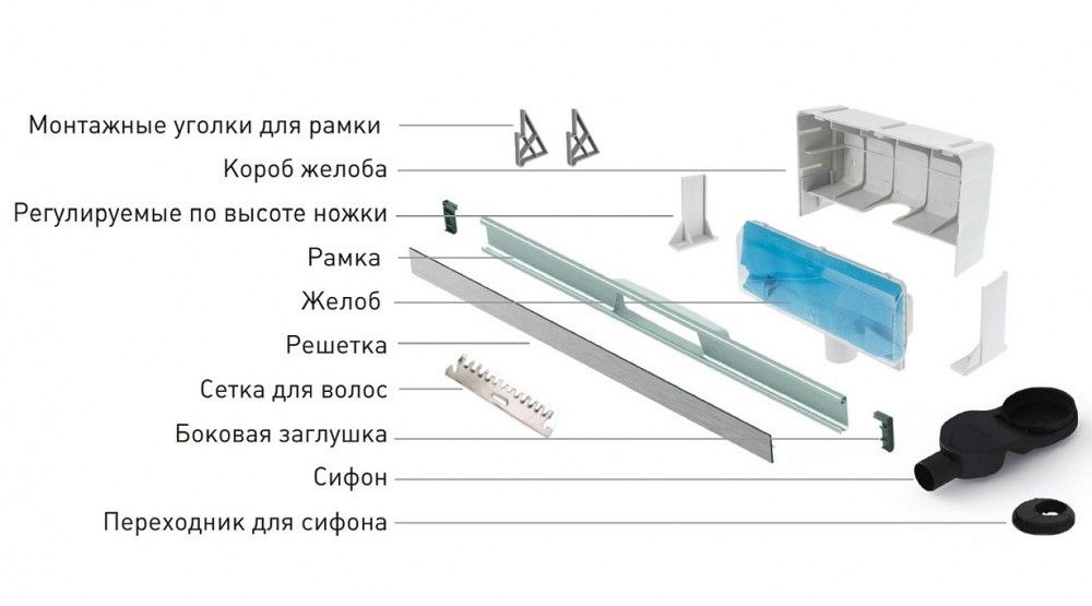 Решетка и рамка, нержавеющая сталь AISI 304Комплект регулировки рамки и монтажные углыСетка для волос, нержавеющая сталь AISI 304Комплект гидроизоляцииЖелоб водосток пристенный, PP Регулируемые по высоте ножки, пластикСамопромывной S-образный сифон с переходником PPгоризонтальный выпуск D50 H60, пропускная способность 42л/мин, монтаж 360°Монтажный ключ, пластик