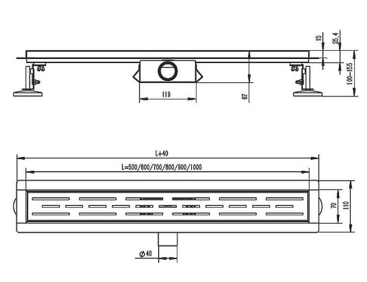 Трап изготовлен из высококачественной нержавеющей стали, в коллекции цвета трапа представлены в нескольких вариантах - черный матовый, сатиновый, золотой, графит. Линейный трап под кладку плитки для душа предназначен для отвода воды с пола или поддона под душем. Широкий диапазон регулировки по высоте позволяет устанавливать трап в новых ванных комнатах. Индивидуально регулируемые ножки обеспечивают беспроблемную установку, даже в тех случаях, когда Вы сталкиваетесь со значительными неровностями в различных частях монтажной поверхности. Трап обеспечивает свободный слив воды в канализационную систему, также собирая мусор, не давая ему засорять сливные каналы. Принцип работы сухого затвора: легкий поплавок диаметром больше сливного отверстия опускается и закрывает трубу в случае высыхания воды. В рабочем положении вода поднимает и удерживает поплавок на одном уровне и система работает, как один из вариантов гидрозатвора. Если трап не используется, то вода из затвора испаряется, а поплавок закрывает сливное отверстие. Диаметр сливной трубы: 40 мм. Максимальная высота монтажа: 155 мм. Минимальная высота монтажа: 100 мм. Выпуск: горизонтальный. Материал корпуса: нержавеющая сталь. Защита от запаха: сухой+гидрозатвор