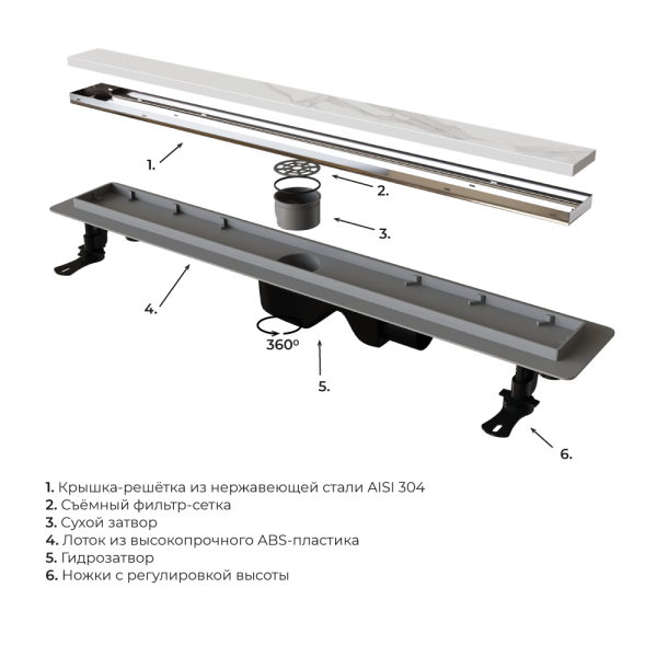 Душевой трап Leo-21 – это сантехническое изделие, созданное для отведения воды из зоны, душевого пространства, выложенное керамической плиткой или мозаикой. Модельный ряд представлен в двух вариантах длины: 60 и 80 см. Трап укомплектован комбинированным затвором гидро+сухой затвор, такая конструкция позволяет на 100% исключить проникновение неприятного запаха в ванную комнату. Решётка выполнена из нержавеющей стали AISI 304, а лоток выполнен из высокопрочного ABS-пластика, такая конструкция обеспечивает максимальную надёжность конструкции более 10 лет. Решётка двухсторонняя-перевернув решётку в неё можно вложить плитку, что позволит получить идеальное сочетание с основным покрытием пола, в комплекте гидроизоляционная лента. Для эффективного стока воды лоток трапа имеет технический уклон, а для улавливания крупного мусора и волос в конструкцию входит съёмный фильтр-сетка, с помощью которого трап с лёгкостью очищается. В комплектации присутствуют ножки с регулировкой высоты, что позволит с лёгкостью произвести монтаж трапа в пол. Нижний сифон имеет поворотное основание, что позволит подвести сливную трубу с любой стороны. Пропускная способность 42 л/мин.