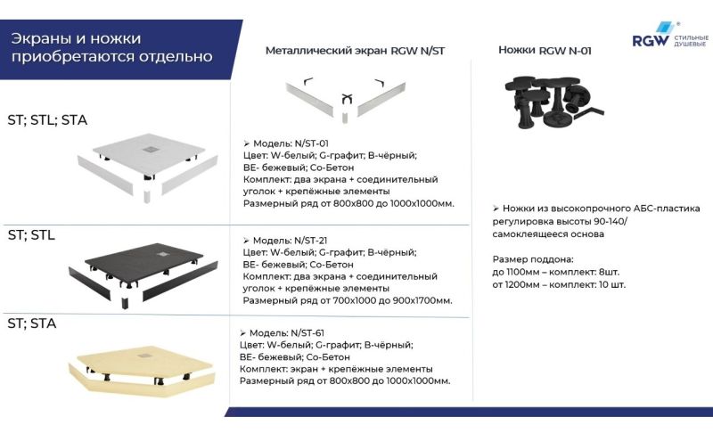 Душевые поддоны RGW ST с фактурой под сланцевый камень.Что вам известно о технологии «искусственный камень»?Это рельефная, но не ребристая поверхность, безопасная для всех членов семьи, в сочетании с низкой теплопроводностью материала для ощущения нагретого солнцем камня под вашими ступнями.Это высокотехнологичный материал - 80% мраморной крошки плюс полиэфирные смолы - обеспечивает беспрецедентную устойчивость к механическим, химическим и другим видам повреждений, делают уборкой легкой и и быстрой, а также выдерживает долговременную весовую нагрузку до 300 кг.В серии душевых поддонов Stone Tray появилась новинка актуальной прямоугольной формы в остро-модном цвете «графит». Невероятно широкий размерный ряд позволит оптимально использовать пространство ванной комнаты, но если вам нужно воплотить по-настоящему уникальный проект, материал позволяет обрезать изделие по индивидуальному размеру.Сдержанный темно-серый цвет впишет поддон в любой интерьер, сделав особый комплимент стилям лофт и хайтек, и позволит реализовать самые яркие идеи в остальном декоре ванной комнаты.Обратите внимание: фактические размеры с учетом заполнения швов могут меняться в пределах -8/+2 мм.По вашему желанию можем установить поддон на ножки: