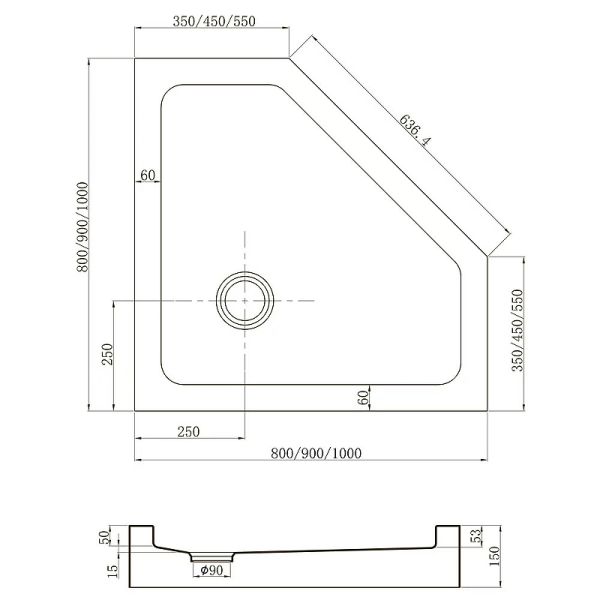Душевой поддон пятиугольный (трапеция) Veconi Tezeo Acrylic TZ-53, 800x800x150, акрил, белый
