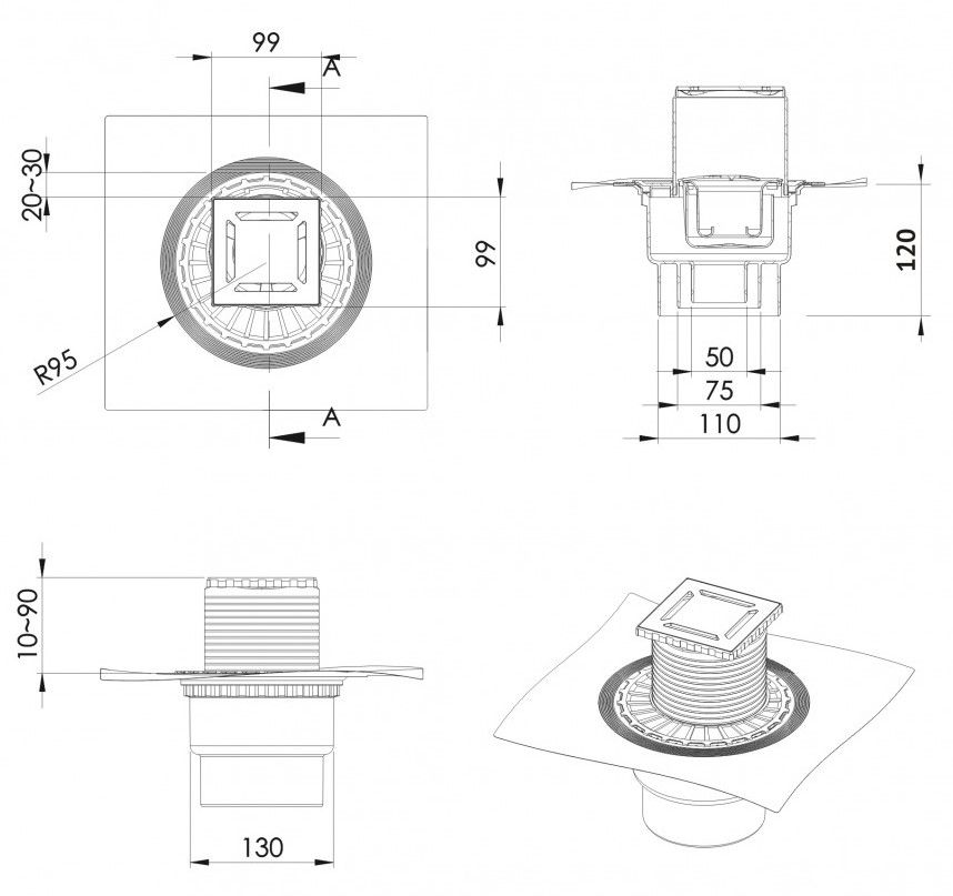 Решетка толщина 3 мм, нержавеющая сталь AISI 304Горловина трапа и эксцентрик, пластикМонтажная заглушка, PPСифон PP с гидроизоляциейВертикальный выпуск D50/75/110, монтаж 360°Комбинированный затворФланец с 3 сторон загибается на 90°Монтажный ключ, пластик