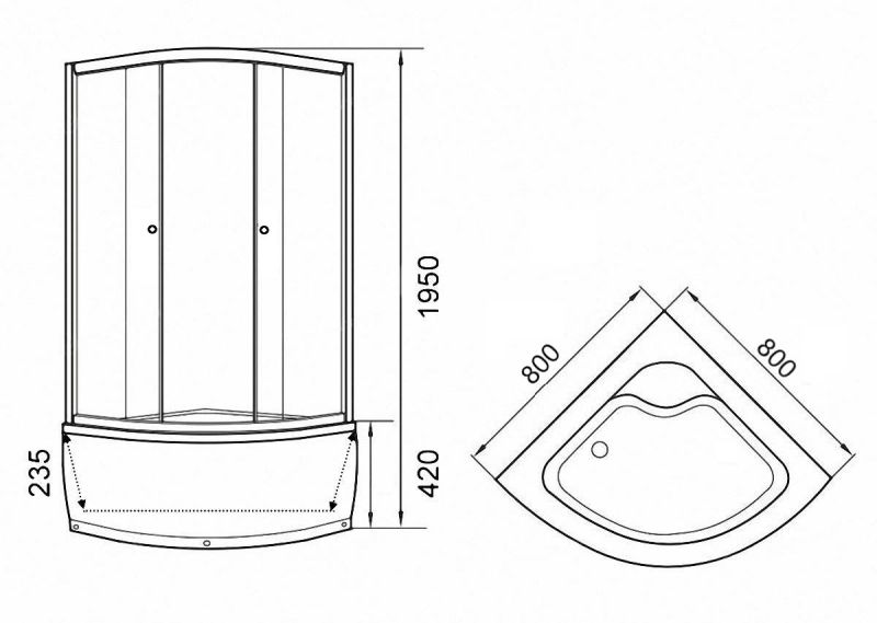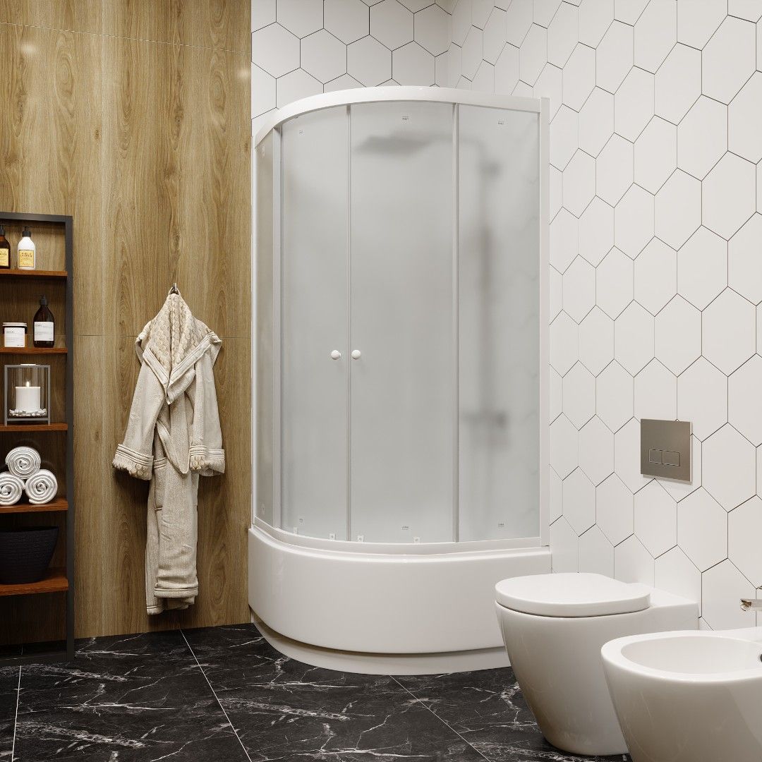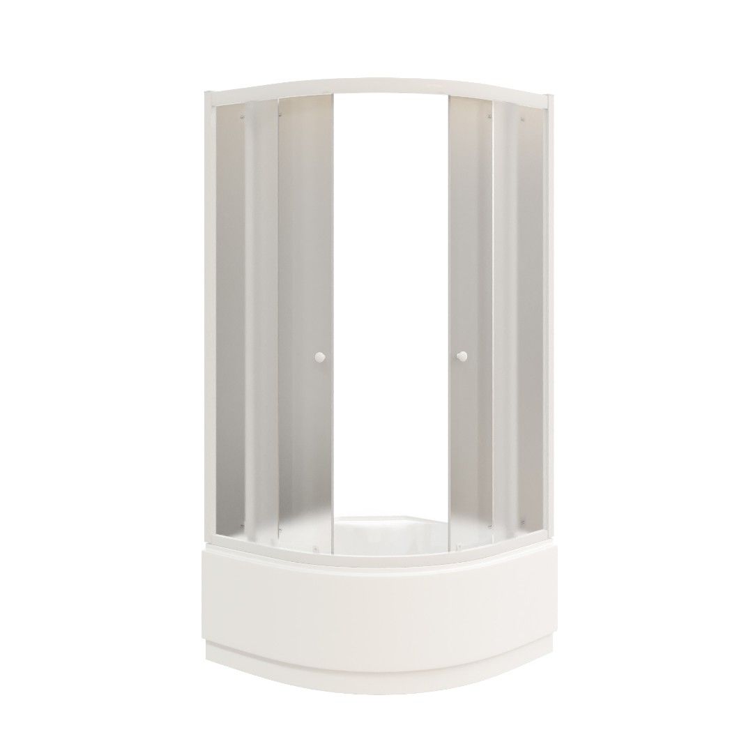 Легкосъемный экран.Достоинства:Матовое полотно скрывает человека внутри, снаружи можно рассмотреть только контуры тела.Плавный ход створок.Двери смыкаются плотно, вода наружу не просачивается.