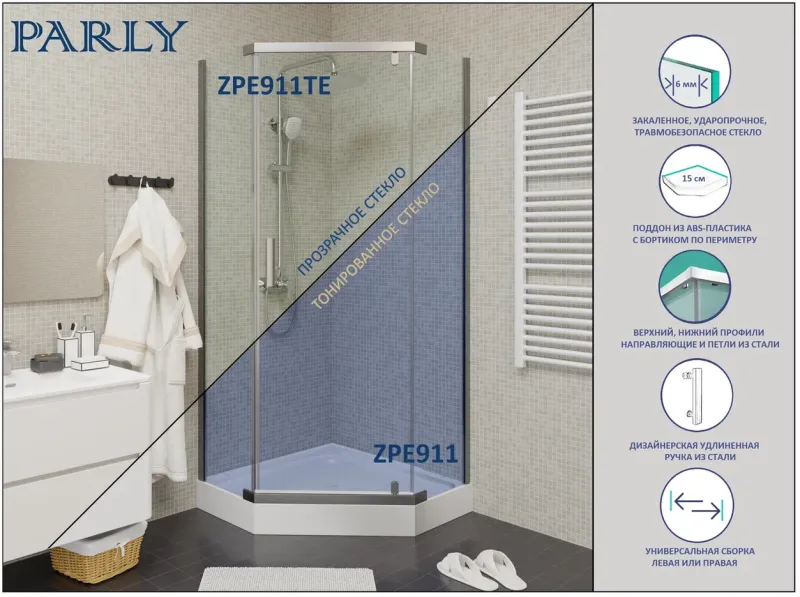 Уголок ZPE911TE душевой PARLY с поддоном (90х90х192)Размер: 90х90х192 смСтильный уголок пятиугольной формы с распашной дверью. Прозрачное стекло и полированный профиль придают модели визуальную легкость. Уголок не утяжеляет пространство и хорошо дополняет любое оформление ванной комнаты.
