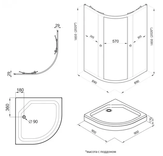 • Высота с поддоном: 202 см
