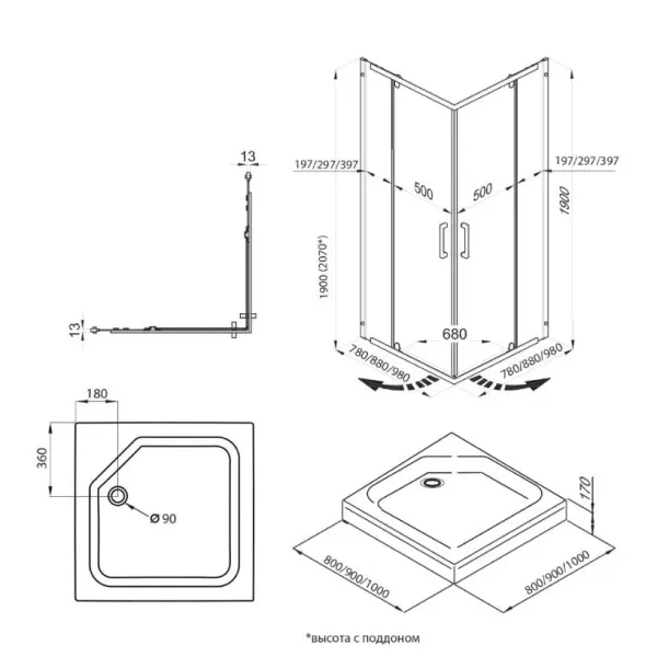 Ширина 90 см Глубина 90 см Высота 207 см Высота поддона 17 см Глубина поддона 6.5 см Толщи... Подробнее
