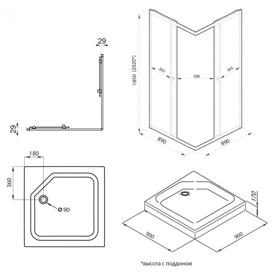 Душевой уголок Размер: 90 x 90 x 185 см Высота с поддоном: 202 см Конструкция дверей... Подробнее