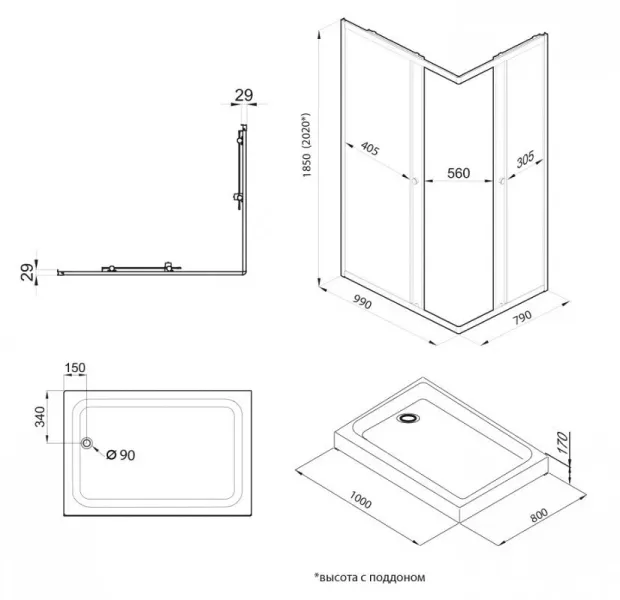 Высота с поддоном: 202 см