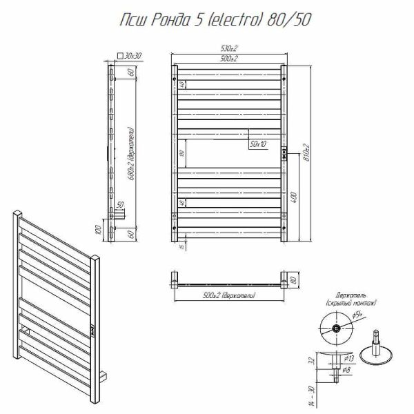 Электрический полотенцесушитель Altasan Ронда 5 Проф Ронда5Проф8050ЧМ Черный муар 80х50Данный полотенцесушитель имеет два вида подключения: подключение стандартным кабелем с вилкой 220 Вольт и скрытое подключение к заранее подведенной на месте установки проводке. Во втором случае необходимо обжать жилы проводки дополнительными клемниками(идут в комплекте) и подсоединить их к жилам полотенцесушителя, согласно цветовой разметки. Подключение можно осуществить, как по левой стороне, так и по правой(имеются соответствующие отводы на каждой из вертикальных труб).