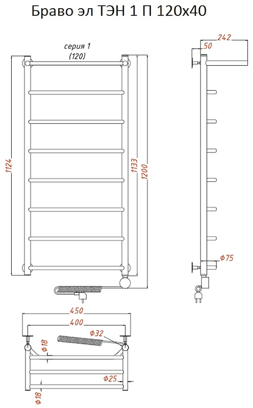 Внимание! Для скрытого монтажа электропроводки необходимо приобрести комплект скрытого подключения.Полотенцесушитель электрический комплектуется ТЭНом с терморегулятором и таймером.Изделие производится из нержавеющей стали AISI 201. Вертикальные трубы d -32 мм., для горизонтальных вставок используется труба d — 18 мм.Нагревательным элементом в полотенцесушителе является ТЭН. Полотенцесушитель заполнен бытовым антифризомЭкономичность: ТЭН нагревает антифриз до нужной температуры и выключается, далее при остывании полотенцесушителя он включается опять. Таким образом он работает не постоянно и получается, что ТЭН потребляет электричество не 300 Вт, а порядка 100 — 150 ВтМощность электрического прибора порядка 100 Вт при стоимости 1 Вт — 5 руб несложно посчитать: 100Вт х 24 = 2,4 кВт в сутки. Стоимость эксплуатации изделия за сутки 2,4 кВт х 5 руб. = 12 руб. При максимальной температуре расход электричества за 30 дней составит порядка 360 руб. При условии если сушка работает круглосуточно на максимальной температуре.Удобство монтажа: Полотенцесушитель крепится к стене на четыре держателя. Изначально ТЭН не установлен в полотенцесушитель для безопасной транспортировки, его можно установить, как справа, так и слева предварительно перевернув полотенцесушитель вверх ногами и выкрутив заглушку с нужной стороны на место в которое установится ТЭН.Примечание. Внимательно изучите инструкцию по установке ТЭНа!Скрытое подключение: Для скрытого монтажа электропроводки необходимо приобрести комплект скрытого подключения.Подключение в розетку: В комплекте с ТЭНом имеется шнур с вилкой, который будет необходим при подключении к розетке.