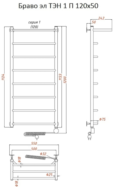 Внимание! Для скрытого монтажа электропроводки необходимо приобрести комплект скрытого подключения.Полотенцесушитель электрический комплектуется ТЭНом с терморегулятором и таймером.Изделие производится из нержавеющей стали AISI 201. Вертикальные трубы d -32 мм., для горизонтальных вставок используется труба d — 18 мм.Нагревательным элементом в полотенцесушителе является ТЭН. Полотенцесушитель заполнен бытовым антифризомЭкономичность: ТЭН нагревает антифриз до нужной температуры и выключается, далее при остывании полотенцесушителя он включается опять. Таким образом он работает не постоянно и получается, что ТЭН потребляет электричество не 300 Вт, а порядка 100 — 150 ВтМощность электрического прибора порядка 100 Вт при стоимости 1 Вт — 5 руб несложно посчитать: 100Вт х 24 = 2,4 кВт в сутки. Стоимость эксплуатации изделия за сутки 2,4 кВт х 5 руб. = 12 руб. При максимальной температуре расход электричества за 30 дней составит порядка 360 руб. При условии если сушка работает круглосуточно на максимальной температуре.Удобство монтажа: Полотенцесушитель крепится к стене на четыре держателя. Изначально ТЭН не установлен в полотенцесушитель для безопасной транспортировки, его можно установить, как справа, так и слева предварительно перевернув полотенцесушитель вверх ногами и выкрутив заглушку с нужной стороны на место в которое установится ТЭН.Примечание. Внимательно изучите инструкцию по установке ТЭНа!Скрытое подключение: Для скрытого монтажа электропроводки необходимо приобрести комплект скрытого подключения.Подключение в розетку: В комплекте с ТЭНом имеется шнур с вилкой, который будет необходим при подключении к розетке.