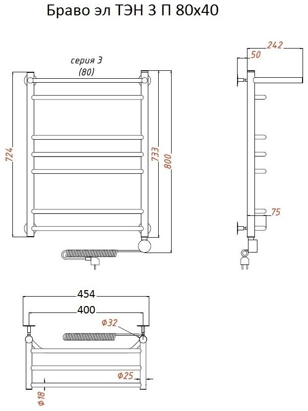 Внимание! Для скрытого монтажа электропроводки необходимо приобрести комплект скрытого подключения. Полотенцесушитель электрический комплектуется ТЭНом с терморегулятором и таймером. Изделие производится из нержавеющей стали AISI 201. Вертикальные трубы d -32 мм., для горизонтальных вставок используется труба d — 18 мм. Нагревательным элементом в полотенцесушителе является ТЭН. Полотенцесушитель заполнен бытовым антифризом.Экономичность: ТЭН нагревает антифриз до нужной температуры и выключается, далее при остывании полотенцесушителя он включается опять. Таким образом он работает не постоянно, и получается, что ТЭН потребляет электричество не 300 Вт, а порядка 100 — 150 Вт.Мощность электрического прибора порядка 100 Вт при стоимости 1 Вт — 5 руб несложно посчитать: 100Вт х 24 = 2,4 кВт в сутки. Стоимость эксплуатации изделия за сутки 2,4 кВт х 5 руб. = 12 руб. При максимальной температуре расход электричества за 30 дней составит порядка 360 руб. При условии если сушка работает круглосуточно на максимальной температуре.Удобство монтажа: Полотенцесушитель крепится к стене на четыре держателя. Изначально ТЭН не установлен в полотенцесушитель для безопасной транспортировки, его можно установить, как справа, так и слева предварительно перевернув полотенцесушитель вверх ногами и выкрутив заглушку с нужной стороны на место в которое установится ТЭН.Примечание. Внимательно изучите инструкцию по установке ТЭНа!Скрытое подключение: Для скрытого монтажа электропроводки необходимо приобрести комплект скрытого подключения.Подключение в розетку: В комплекте с ТЭНом имеется шнур с вилкой, который будет необходим при подключении к розетке.