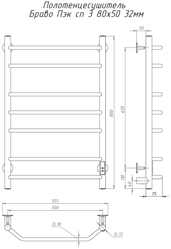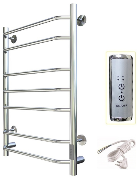 Внимание! Для скрытого монтажа электропроводки необходимо приобрести комплект скрытого подключения. Полотенцесушитель электрический комплектуется ТЭНом с терморегулятором и таймером. Изделие производится из нержавеющей стали AISI 201. Вертикальные трубы d -32 мм., для горизонтальных вставок используется труба d — 18 мм. Нагревательным элементом в полотенцесушителе является ТЭН. Полотенцесушитель заполнен бытовым антифризом.Экономичность: ТЭН нагревает антифриз до нужной температуры и выключается, далее при остывании полотенцесушителя он включается опять. Таким образом он работает не постоянно, и получается, что ТЭН потребляет электричество не 300 Вт, а порядка 100 — 150 Вт.Мощность электрического прибора порядка 100 Вт при стоимости 1 Вт — 5 руб несложно посчитать: 100Вт х 24 = 2,4 кВт в сутки. Стоимость эксплуатации изделия за сутки 2,4 кВт х 5 руб. = 12 руб. При максимальной температуре расход электричества за 30 дней составит порядка 360 руб. При условии если сушка работает круглосуточно на максимальной температуре.Удобство монтажа: Полотенцесушитель крепится к стене на четыре держателя. Изначально ТЭН не установлен в полотенцесушитель для безопасной транспортировки, его можно установить, как справа, так и слева предварительно перевернув полотенцесушитель вверх ногами и выкрутив заглушку с нужной стороны на место в которое установится ТЭН.Примечание. Внимательно изучите инструкцию по установке ТЭНа!Скрытое подключение: Для скрытого монтажа электропроводки необходимо приобрести комплект скрытого подключения.Подключение в розетку: В комплекте с ТЭНом имеется шнур с вилкой, который будет необходим при подключении к розетке.