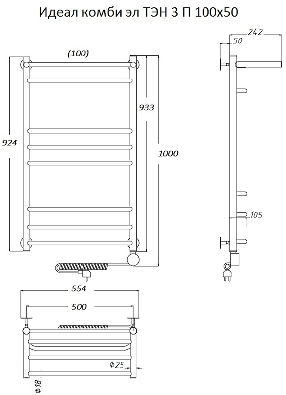 Внимание! Для скрытого монтажа электропроводки необходимо приобрести комплект скрытого подключения.Полотенцесушитель электрический комплектуется ТЭНом с терморегулятором и таймером.Изделие производится из нержавеющей стали AISI 201. Вертикальные трубы d -32 мм., для горизонтальных вставок используется труба d — 18 мм.Нагревательным элементом в полотенцесушителе является ТЭН. Полотенцесушитель заполнен бытовым антифризомЭкономичность: ТЭН нагревает антифриз до нужной температуры и выключается, далее при остывании полотенцесушителя он включается опять. Таким образом он работает не постоянно и получается, что ТЭН потребляет электричество не 300 Вт, а порядка 100 — 150 ВтМощность электрического прибора порядка 100 Вт при стоимости 1 Вт — 5 руб несложно посчитать: 100Вт х 24 = 2,4 кВт в сутки. Стоимость эксплуатации изделия за сутки 2,4 кВт х 5 руб. = 12 руб. При максимальной температуре расход электричества за 30 дней составит порядка 360 руб. При условии если сушка работает круглосуточно на максимальной температуре.Удобство монтажа: Полотенцесушитель крепится к стене на четыре держателя. Изначально ТЭН не установлен в полотенцесушитель для безопасной транспортировки, его можно установить, как справа, так и слева предварительно перевернув полотенцесушитель вверх ногами и выкрутив заглушку с нужной стороны на место в которое установится ТЭН.Примечание. Внимательно изучите инструкцию по установке ТЭНа!Скрытое подключение: Для скрытого монтажа электропроводки необходимо приобрести комплект скрытого подключения.Подключение в розетку: В комплекте с ТЭНом имеется шнур с вилкой, который будет необходим при подключении к розетке.