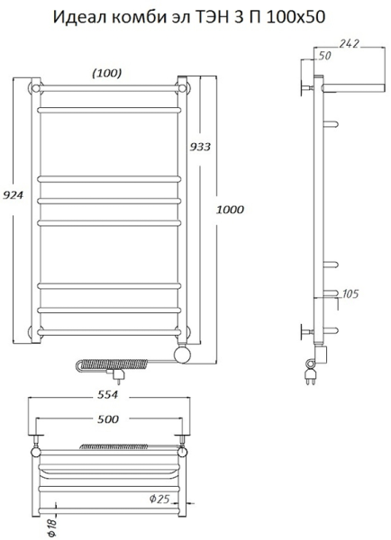 Электрический полотенцесушитель Тругор Идеал комби 3 П с полкой 100x50см хром Идеал/комби3/элТЭН10050П