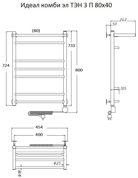 Электрический полотенцесушитель Тругор Идеал комби 3 П с полкой 80x40см хром Идеал/комби3/элТЭН8040П