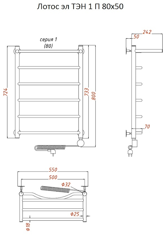 Внимание! Для скрытого монтажа электропроводки необходимо приобрести комплект скрытого подключения.Полотенцесушитель электрический комплектуется ТЭНом с терморегулятором и таймером.Изделие производится из нержавеющей стали AISI 201. Вертикальные трубы d -32 мм., для горизонтальных вставок используется труба d — 18 мм.Нагревательным элементом в полотенцесушителе является ТЭН. Полотенцесушитель заполнен бытовым антифризомЭкономичность: ТЭН нагревает антифриз до нужной температуры и выключается, далее при остывании полотенцесушителя он включается опять. Таким образом он работает не постоянно и получается, что ТЭН потребляет электричество не 300 Вт, а порядка 100 — 150 ВтМощность электрического прибора порядка 100 Вт при стоимости 1 Вт — 5 руб несложно посчитать: 100Вт х 24 = 2,4 кВт в сутки. Стоимость эксплуатации изделия за сутки 2,4 кВт х 5 руб. = 12 руб. При максимальной температуре расход электричества за 30 дней составит порядка 360 руб. При условии если сушка работает круглосуточно на максимальной температуре.Удобство монтажа: Полотенцесушитель крепится к стене на четыре держателя. Изначально ТЭН не установлен в полотенцесушитель для безопасной транспортировки, его можно установить, как справа, так и слева предварительно перевернув полотенцесушитель вверх ногами и выкрутив заглушку с нужной стороны на место в которое установится ТЭН.Примечание. Внимательно изучите инструкцию по установке ТЭНа!Скрытое подключение: Для скрытого монтажа электропроводки необходимо приобрести комплект скрытого подключения.Подключение в розетку: В комплекте с ТЭНом имеется шнур с вилкой, который будет необходим при подключении к розетке.