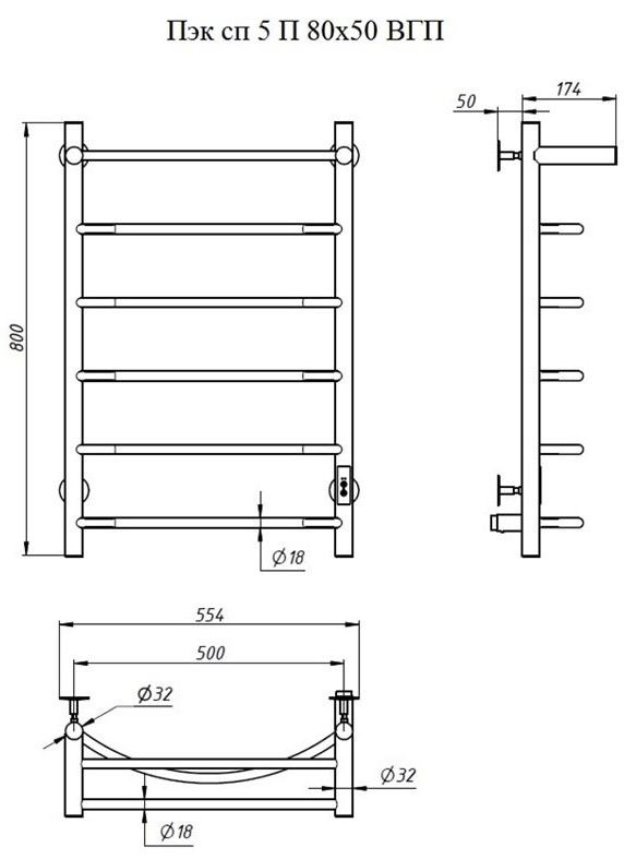 Электрический полотенцесушитель Тругор Пэк сп 5 П с полкой 80x50см чёрный Пэксп5П/8050черныйВГП купить