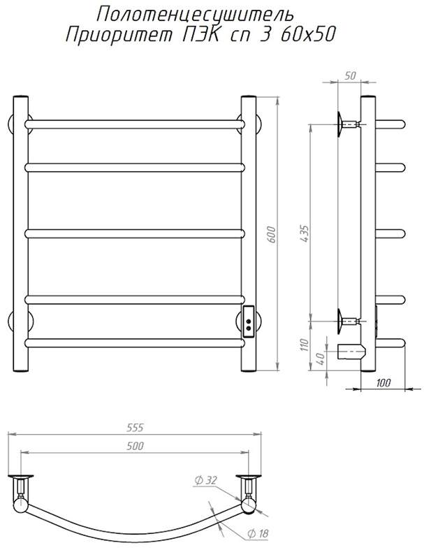ПЭК — Полотенцесушитель электрический кабельный. Изделие производится из нержавеющей стали AISI 201. Вертикальные трубы d -32 мм., для горизонтальных вставок используется труба d — 18 мм.Нагревательным элементом в полотенцесушителе является греющий кабель — аналог «теплого пола», кабель заправляется внутрь каждой трубы и передает тепло на поверхность изделия. Во включенном состоянии постоянно поддерживается температура 50-600.Экономичность: Полотенцесушитель снабжен панелью управления. Кнопка включения/выключения и таймер на 2 часа и 4 часа, который позволяет включать изделие на ограниченное время. Эта функция дает возможность экономить электричество.Мощность электрического прибора порядка 60W при стоимости 1 кВт — 5 руб несложно посчитать: 60W х 24 = 1,5 кВт в сутки. Стоимость эксплуатации изделия за сутки 1,5 кВт х 5 руб. = 7,5 руб. Максимальный расход электричества за месяц примерно 225 руб. При условии если сушка работает круглосуточно.Удобство монтажа: Полотенцесушитель крепится к стене на четыре держателя. Универсальное исполнение изделия позволяет подключить его, как справа, так и слева.Скрытое подключение: Благодаря приваренным в нижней части вертикальных труб двум распаячным коробкам, в которых соединяется электропроводка, возможно скрытое подключение к электричеству слева и справа.Подключение в розетку: В комплекте также имеется шнур с вилкой, который будет необходим при подключении к розетке.Панель включения:РЕЖИМ №1 — постоянный нагревРЕЖИМ №2 — работа в течение 2 часов с последующим отключением.РЕЖИМ №3 — работа в течение 4 часов с последующим отключением.