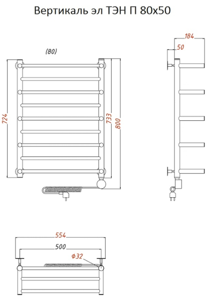 Внимание! Для скрытого монтажа электропроводки необходимо приобрести комплект скрытого подключения.Полотенцесушитель электрический комплектуется ТЭНом с терморегулятором и таймером.Изделие производится из нержавеющей стали AISI 201. Вертикальные трубы d -32 мм., для горизонтальных вставок используется труба d — 18 мм.Нагревательным элементом в полотенцесушителе является ТЭН. Полотенцесушитель заполнен бытовым антифризомЭкономичность: ТЭН нагревает антифриз до нужной температуры и выключается, далее при остывании полотенцесушителя он включается опять. Таким образом он работает не постоянно и получается, что ТЭН потребляет электричество не 300 Вт, а порядка 100 — 150 ВтМощность электрического прибора порядка 100 Вт при стоимости 1 Вт — 5 руб несложно посчитать: 100Вт х 24 = 2,4 кВт в сутки. Стоимость эксплуатации изделия за сутки 2,4 кВт х 5 руб. = 12 руб. При максимальной температуре расход электричества за 30 дней составит порядка 360 руб. При условии если сушка работает круглосуточно на максимальной температуре.Удобство монтажа: Полотенцесушитель крепится к стене на четыре держателя. Изначально ТЭН не установлен в полотенцесушитель для безопасной транспортировки, его можно установить, как справа, так и слева предварительно перевернув полотенцесушитель вверх ногами и выкрутив заглушку с нужной стороны на место в которое установится ТЭН.Примечание. Внимательно изучите инструкцию по установке ТЭНа!Скрытое подключение: Для скрытого монтажа электропроводки необходимо приобрести комплект скрытого подключения.Подключение в розетку: В комплекте с ТЭНом имеется шнур с вилкой, который будет необходим при подключении к розетке.