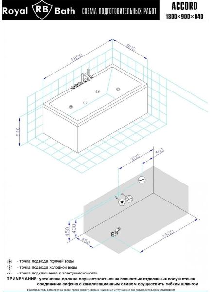 Акриловая ванна Royal Bath - идеальный выбор для создания атмосферы релакса и умиротворения, как в просторной в ванной комнате, так и в комнатном санузле. Основным преимуществом ванны из акрила считается её малый вес, высокая гигиеничность данного материала и низкая теплопроводность, долго сохраняющая комфортную температуру воды.Форма ванны Royal Bath замечательно подойдет к любому интерьерному решению, в различных вариантах размещения внутри ванной комнаты. Пристенная установка - это наиболее традиционный вид установки, а при использовании декоративного экрана пространство под ванной можно использовать как место хранения моющих средств. Оптимальная глубина позволяет принимать ванну с максимальным комфортом и полным расслаблением. Ванна Royal Bath выполнена со строгим соблюдением всех значительных элементов современного стиля.Благодаря тому, что родина бренда Royal Bath - Россия, можно смело быть уверенным в непревзойденном качестве и долговечности ванны, так как производство полностью соответствует стандартам качества. Акриловая ванна Royal Bath - это незаменимый, основной элемент любой ванной комнаты, без которого невозможно обойтись, ни в многоквартирном доме, ни в загородном коттедже.Комплектация гидромассажной ванны:- акриловая ванна Accord 180x90x64;- каркас сварной к ванне Accord 180;- панель фронтальная к ванне Accord 180;- панель боковая Accord 90 L;- панель боковая Accord 90 R;- гидромассажная система на 6 форсунок;- спинной массаж на 6 форсунок;- слив-перелив для ванны полуавтомат 60 см.