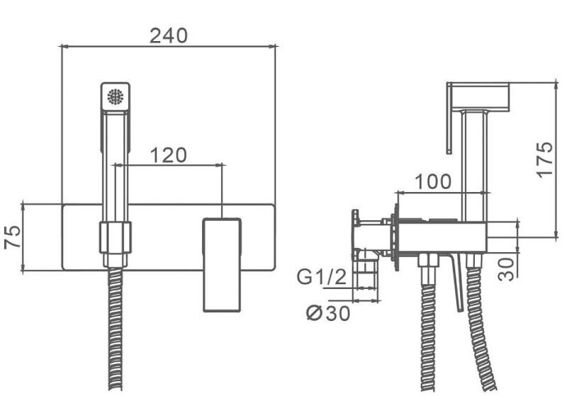 Встраиваемый гигиенический душ, выполнен из латуни, шланг 120 см и лейка в комплекте