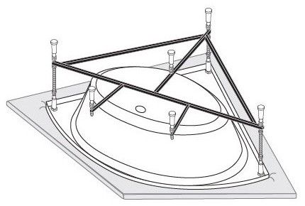 Усиленный цельносварной стальной каркас для ванны изготовлен из квадратного металлического профиля 2х2 см и окрашен темно-бронзовой молотковой краской. Каркас имеет 8 ножек и 4 опоры в борт ванны снизу. Предназначен для использования во влажных помещениях.