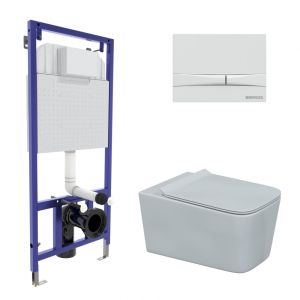 Полный комплект BERGES для монтажа подвесного унитаза. 1. Инсталляция NOVUM525Толщина бачка 80 мм.Межосевое расстояние под крепежные шпильки унитаза 18 и 23 см.Резервуар воды объемом 10 литров с тепло-шумоизоляцией.Уровень шума при давлении 3 бар не превышает 13 дБ.Подвод воды сверху (G1/2 наружная).Объем смыва 3/6 литра с возможностью регулировки. Металлический каркас, окрашенный антикоррозийной эмалью, расчетная нагрузка до 400 кг.Ножки регулировки высоты из оцинкованной стали. Возможность установки в угол. 2. кнопка F1 белаяABS-пластик 3. унитаз FLOE Rimless,безободковая система смыва, антибактериальное покрытиеэкономия воды, скрытый крепеж 4. сиденье дюропласт Floe Slim SOмикролифт, быстросъем. Все крепежи для установки в комплекте